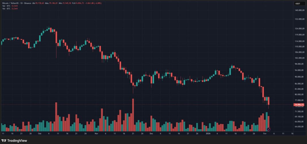 Bitcoin declined from above $126,000 in early October 2025 to below the $75,000 level by early February 2026, showing sustained downward pressure over the four-month period.