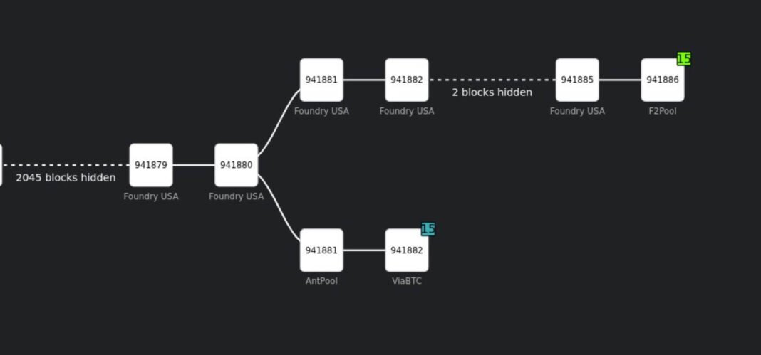 The Bitcoin network experienced a rare two-block reorg on Mar. 23, at block height 941,880. Foundry mined six consecutive blocks, AntPool and ViaBTC briefly extended a competing branch.