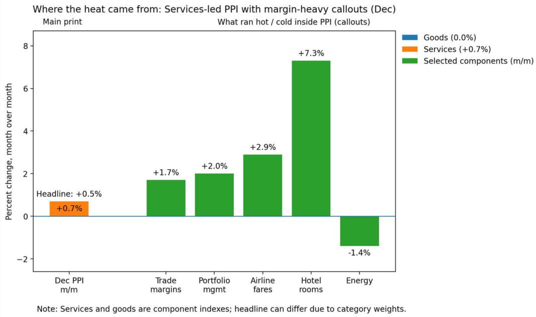 December’s PPI rose 0.5% month-over-month, driven by services up 0.7% while goods remained flat, with hotels surging 7.3%.