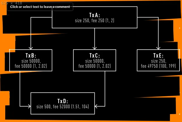 Look at the above example graph of transactions, the feerates are shown as such in parentheses (ancestor feerate, descendant feerate). A miner looking at transaction E would likely include it in the next block, a small transaction paying a very high fee with a single small ancestor. However, if a node’s mempool was filling up, it would look at transaction A with two massive children paying a low relative fee, and likely evict it or not accept and keep it if it was just received.