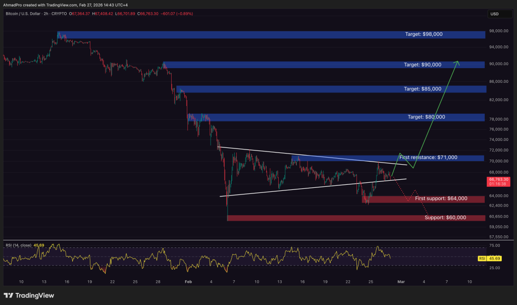However, $64,000 is doing heavy lifting. It has already been tested several times. Another hard retest weakens it. If it breaks, $60,000 comes into play shortly after.