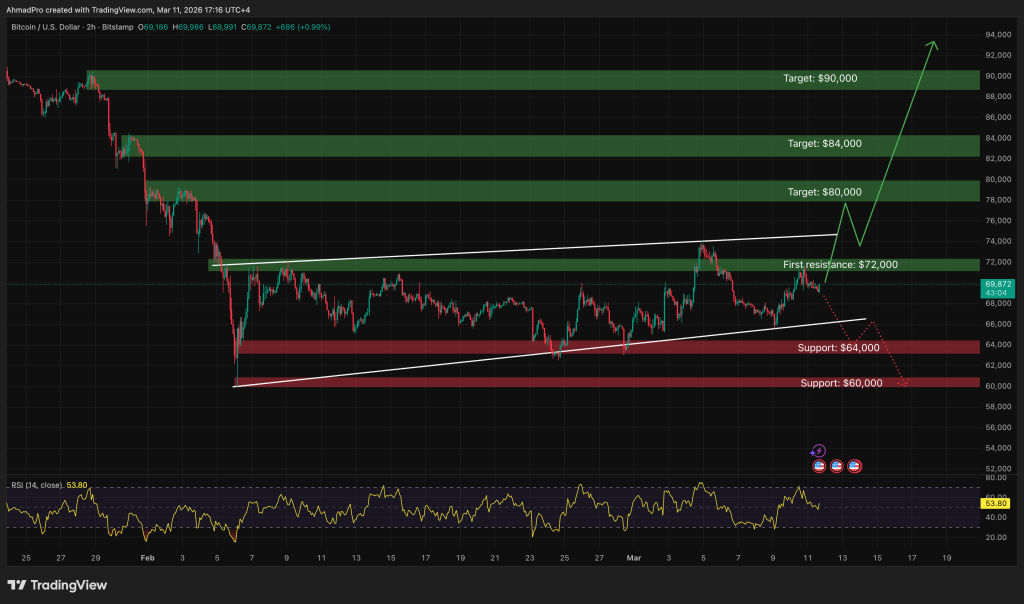 Right now BTC is sitting just under that resistance while still holding above the rising support trendline. As long as that structure stays intact, another push toward $72,000 is still on the table.