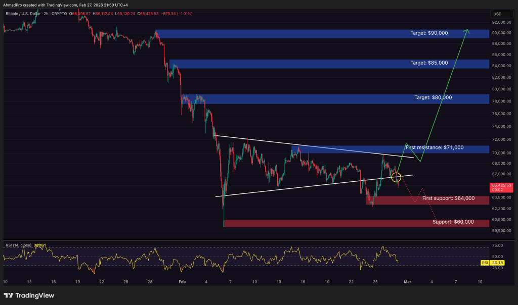 Now $64,000 is the key. It has already been tested multiple times. If it breaks cleanly, $60,000 opens, and the triangle is likely a distribution. That could trigger a deeper liquidity sweep.
