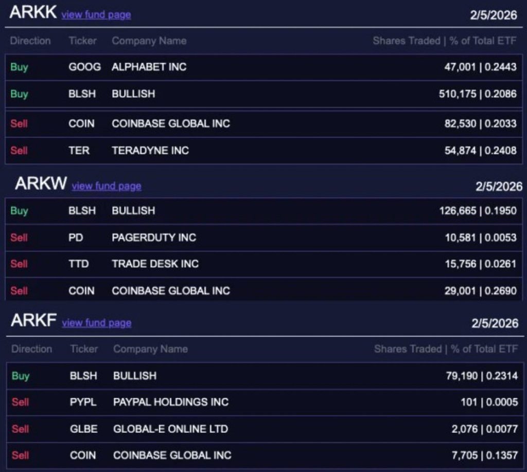 Just a few weeks ago, ARK was heading the other way. The firm dumped about $17.4 million worth of COIN on Feb. 5 and Feb. 6 while the broader market was sliding. At the same time, it rotated capital into the crypto exchange Bullish.