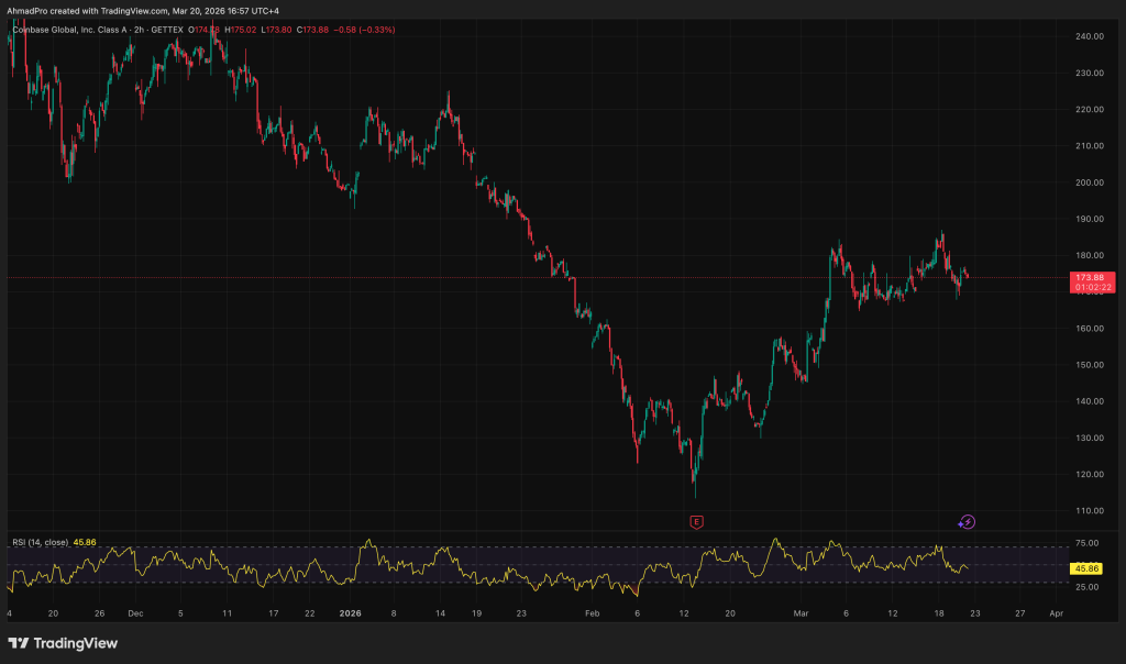 Coinbase stock closed at $202.24 on March 19. Basically flat on the day but the week told a different story.