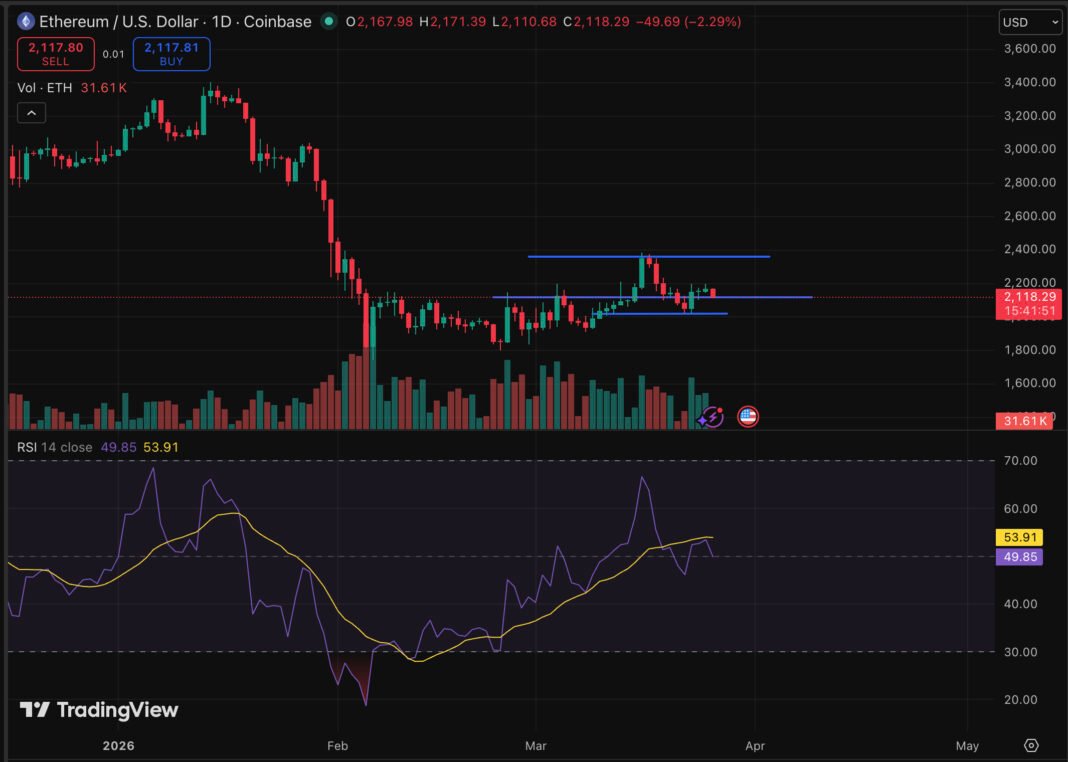 The RSI reads neutral at 49-53 suggests trend strength is building but not yet committed. Key supports stack at $2,050, then $1,830 and $1,790. Lose $1,790 and the weekly head-and-shoulders pattern, which targets $1,320, becomes the dominant technical narrative. Bears will maintain control until a convincing $3,000 reclaim materializes, per multiple analysts tracking the setup.