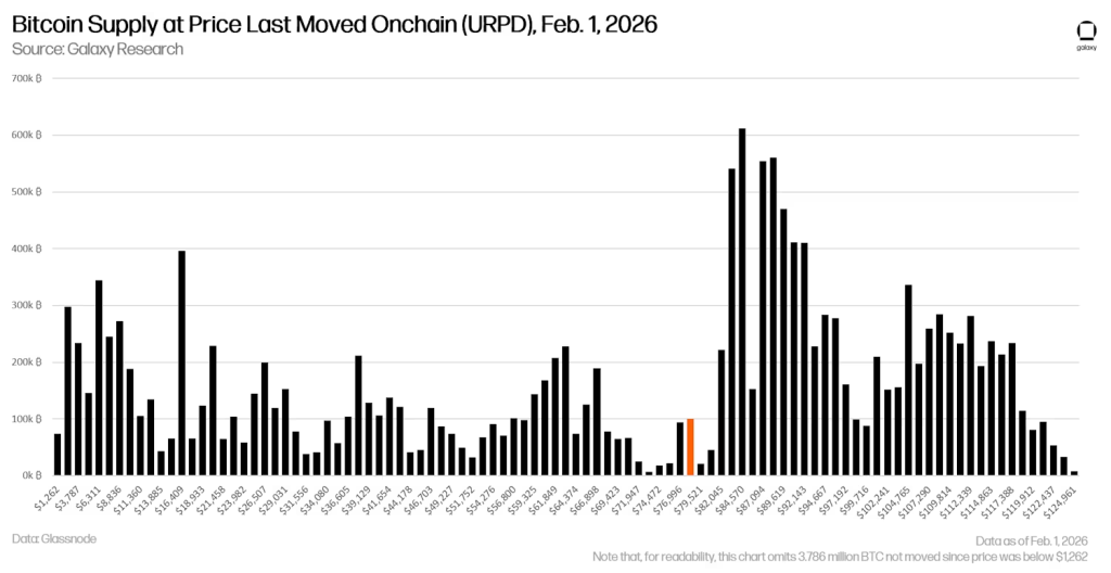 According to Galaxy Research’s Bitcoin supply data based on when coins last moved onchain, a clear gap in ownership is visible in the $70,000-$80,000 range.