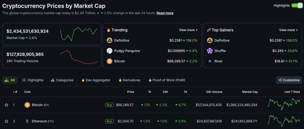 It comes as the total crypto market cap climbed 2.6% overnight and is back above $2.4 trillion, with Bitcoin price and Ethereum USD reclaiming key levels at $69,000 and $2,000, respectively.