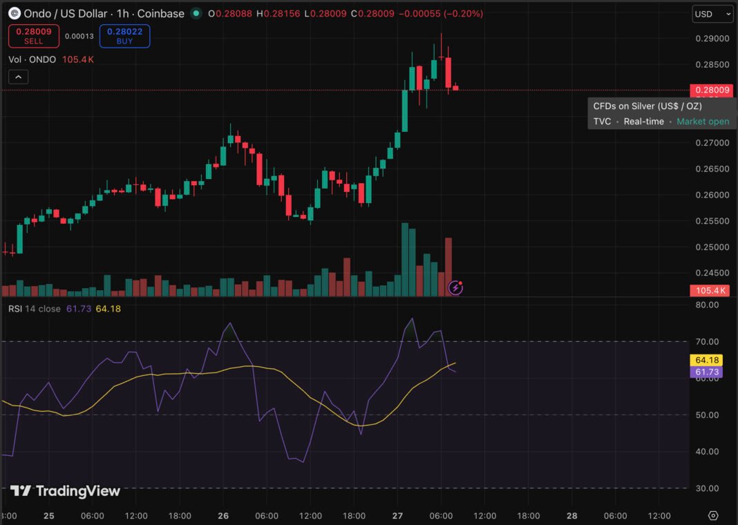 ONDO is running to break the $0,29 channel, and the technical picture is about as ambiguous as it gets. March 26 closed at $0.27 on $80.8 million in volume, respectable activity for a mid-cap RWA token.