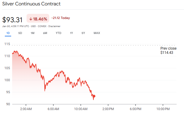 Silver shot to a fresh all-time high on Thursday and briefly hit over $121 per ounce, only to be violently pulled back, falling over 15% on Friday to about $97.