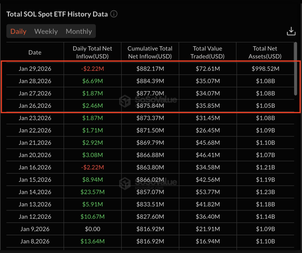 Data from SoSoValue indicates that Solana’s ETFs have raised nearly $9 million this past week, bringing the total assets held in these funds to $1 billion.