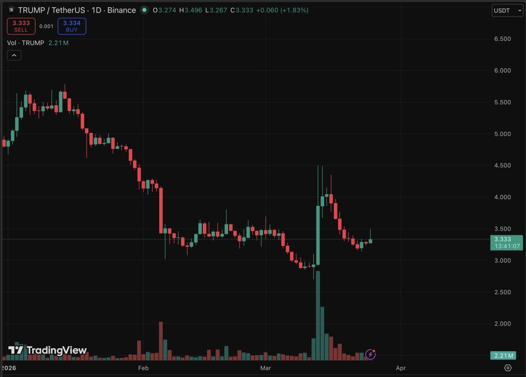 TRUMP crypto hangs precariously around the $3.34 mark, posting a deceptive 3.11% gain over the last 24 hours while trading volume plummeted by 8.84% to $145.36 million. The asset has shed 10% of its value in the past week, consolidating after a series of sharp corrections that have shaken holder confidence.