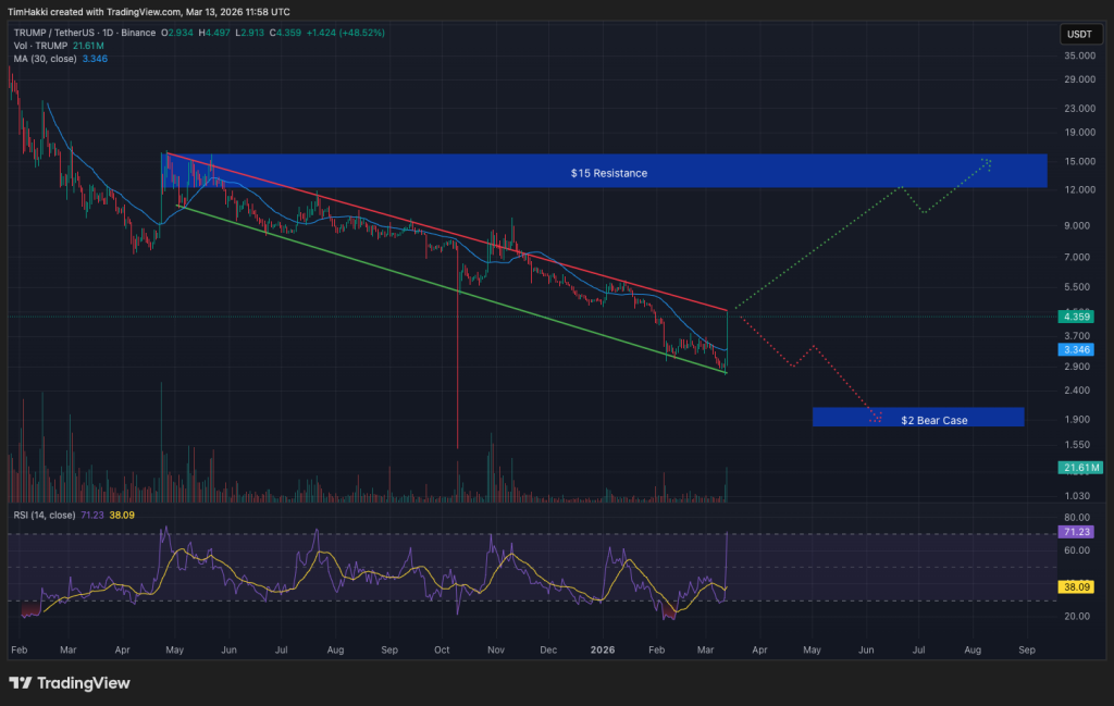 The announcement triggered immediate volatility for the $TRUMP token. The price rallied 53% on the news to hit $4.37, a level not seen since January 31.