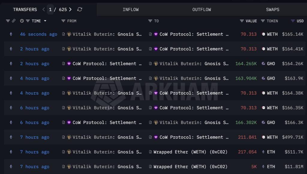 On-chain analysts at Lookonchain reported that Buterin sold 493 Ethereum (ETH), worth roughly $1.16 million at the time of the transaction.