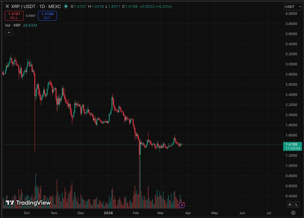 At press time, XRP is changing hands between $1.41 and $1.42, holding precariously above the critical support floor of $1.27. This level, aligned with the 23.6% Fibonacci retracement, serves as the primary defense against a deeper slide toward $1.11. Analysts describe the current zone as “capitulation territory,” where short-term holders often exit at unrealized losses, potentially clearing the books for accumulation.
