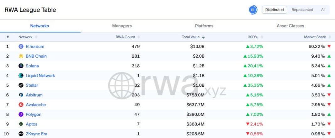 Ethereum leads tokenized real-world assets with $13 billion in total value and 479 projects, commanding 60.22% market share across distributed networks.